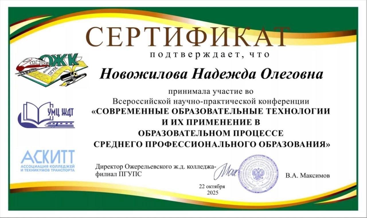 22 октября 2025 года преподаватель Узловского железнодорожного техникума – филиала ПГУПС Надежда Олеговна Новожилова приняла активное участие во Всероссийской научно-практической конференции «Современные образовательные технологии и их применение в образовательном процессе среднего профессионального образования». Организатором мероприятия выступил Ожерельевский железнодорожный колледж.