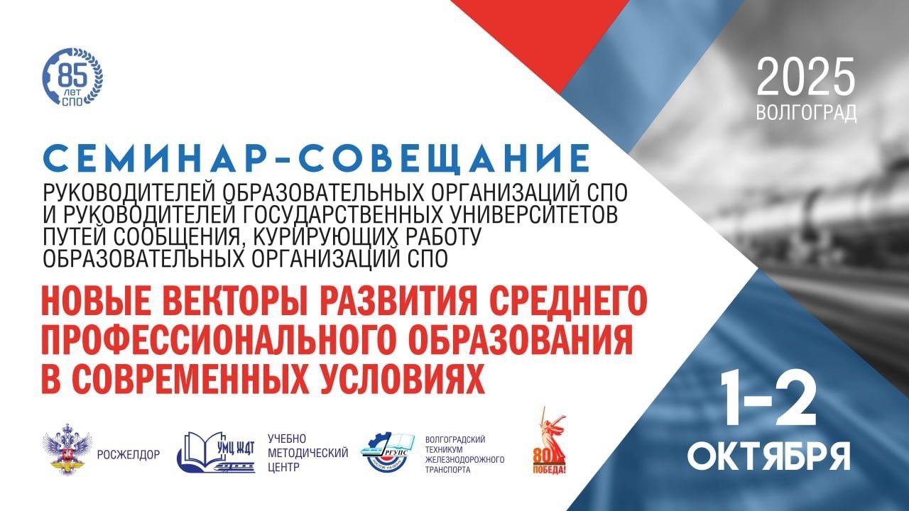 С 1 по 2 октября 2025 года на базе Волгоградского техникума железнодорожного транспорта – филиала РГУПС состоялся первый день работы семинара-совещания руководителей образовательных организаций среднего профессионального образования и руководителей государственных университетов путей сообщения. Тема встречи — «Новые векторы развития среднего профессионального образования в современных условиях».