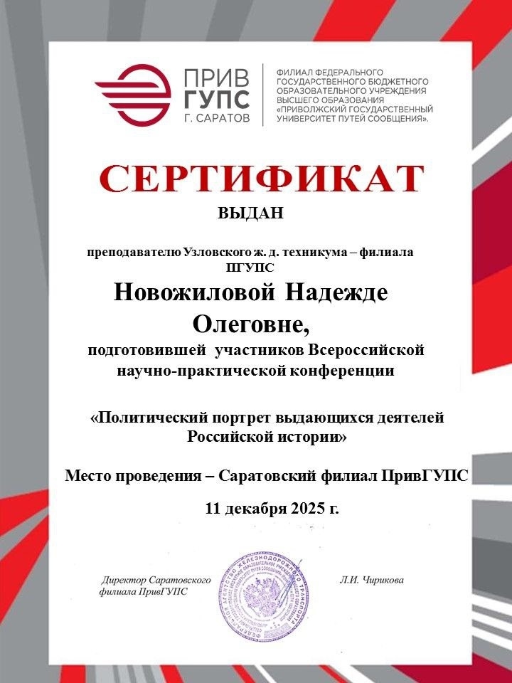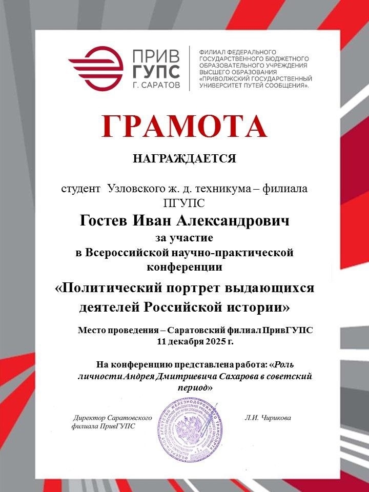 11 декабря 2025 года студент Узловского железнодорожного техникума — филиала ПГУПС, обучающийся группы УЗОП-312, Гостев Иван Александрович был награждён грамотой за активное участие во Всероссийской научно-практической конференции «Политический портрет выдающихся деятелей российской истории», организованной Саратовским филиалом Приволжского государственного университета путей сообщения.