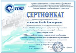 25 февраля 2026 года студентка Узловского железнодорожного техникума — филиала Петербургский государственный университет путей сообщения Императора Александра I группы УЗОП-312 Алешина Влада Викторовна была отмечена сертификатом за активное участие в VII Всероссийской научно-практической конференции.