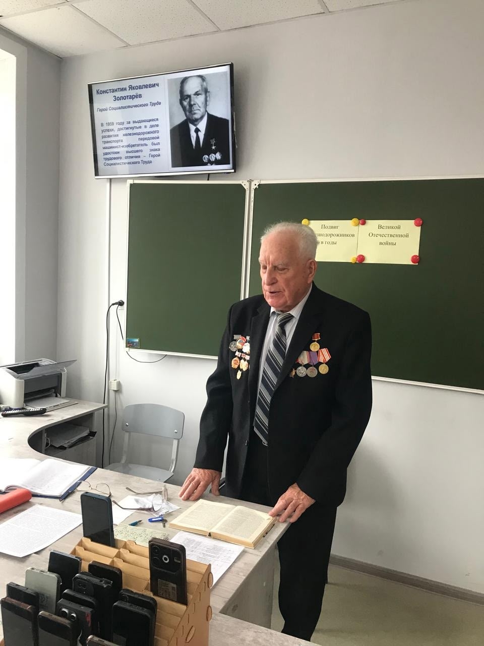 Особый интерес у студентов вызвало выступление ветерана труда, Почётного железнодорожника Золотухина Вениамина Егоровича, чей трудовой стаж составляет 65 лет. Он работал машинистом, машинистом-инструктором, мастером производственного обучения и преподавателем в ТЖТ им. Б. Ф. Сафонова. Вениамин Егорович рассказал о своём военном детстве, о работе в депо и сотрудничестве с Золотарёвым К. Я. В завершение выступления ветеран обратился к студентам с напутствием быть честными, ответственными и добросовестными как в труде, так и в жизни.
