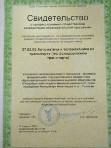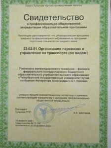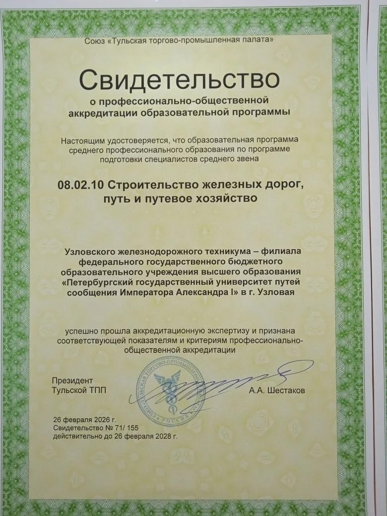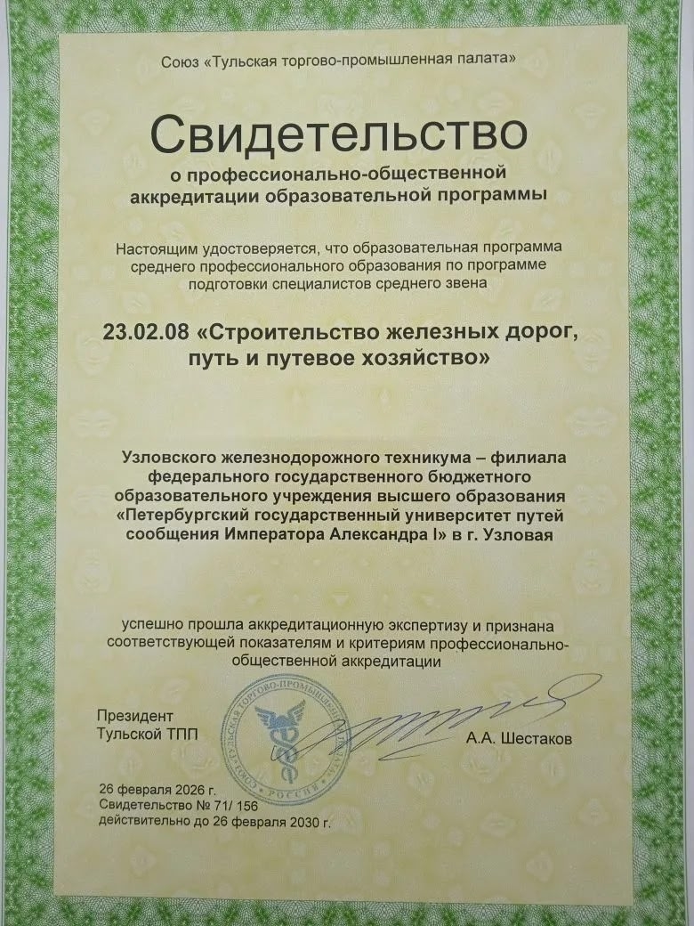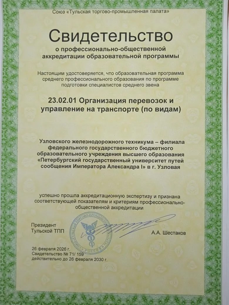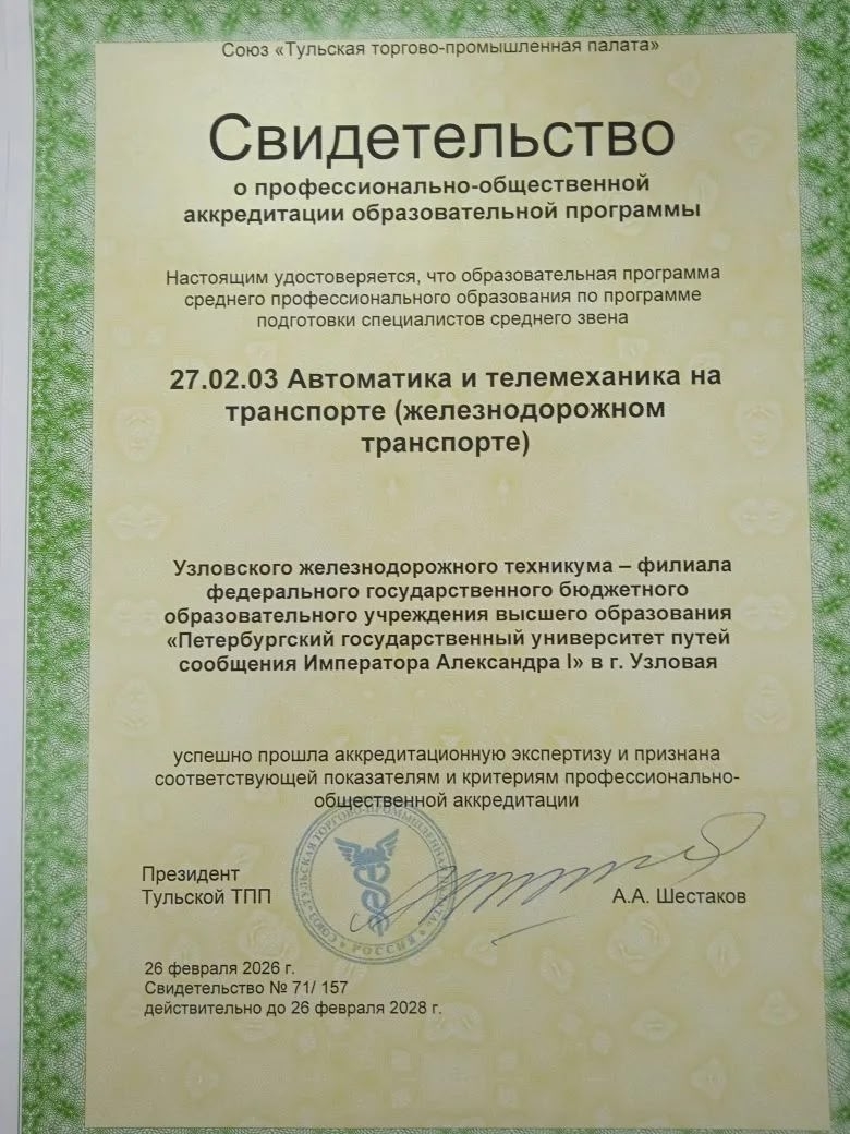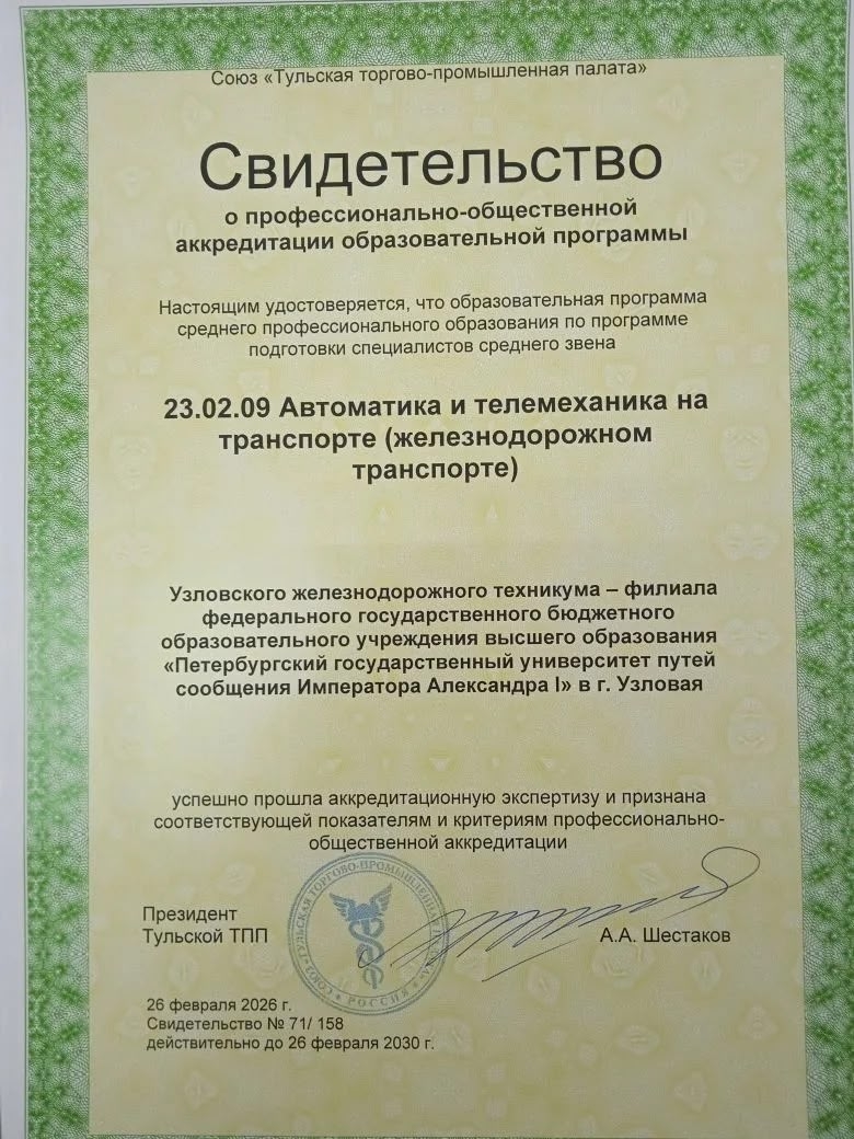 26 февраля 2026 года Узловский железнодорожный техникум — филиал Петербургский государственный университет путей сообщения Императора Александра I получил свидетельства о профессионально-общественной аккредитации по пяти образовательным программам среднего профессионального образования. Аккредитация была проведена Тульская торгово‑промышленная палата.