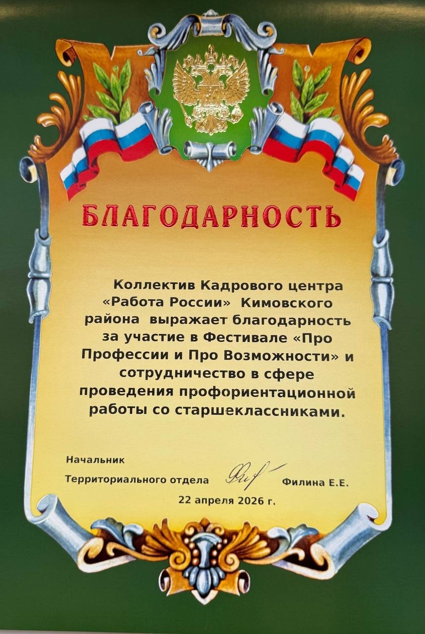 22 апреля 2026 года в здании Кадрового центра Работа России по адресу: Кимовск, ул. Толстого, д. 38а состоялся фестиваль «Про Профессии и Про Возможности».