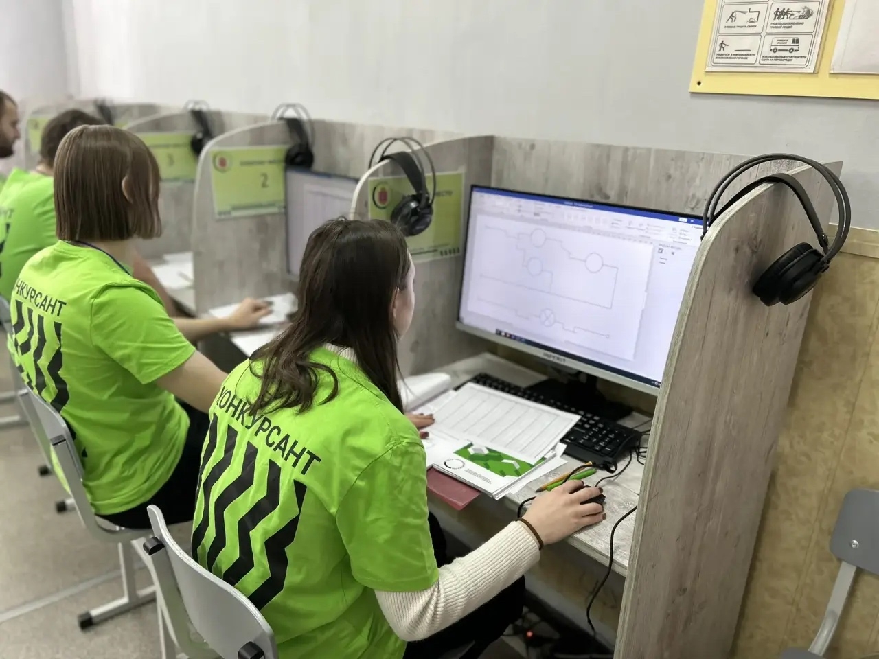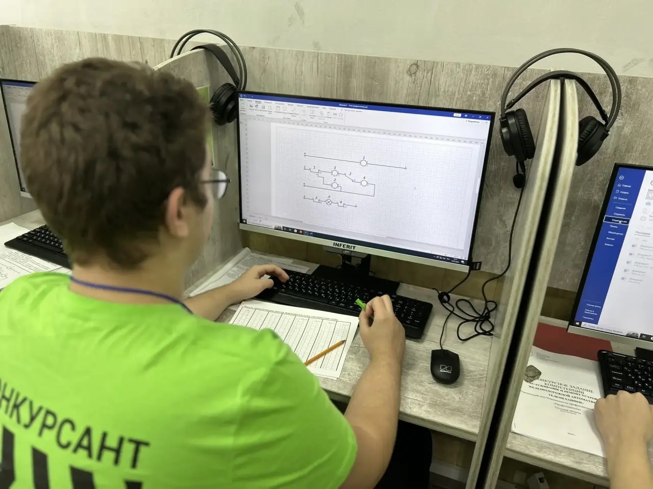В рамках конкурсных испытаний участникам предстояло выполнить ряд профессиональных заданий. Конкурсанты с использованием графического редактора вычерчивали принципиальную схему, представленную в задании, и наносили необходимые условные обозначения для последующей разработки монтажной схемы устройства СЦБ.