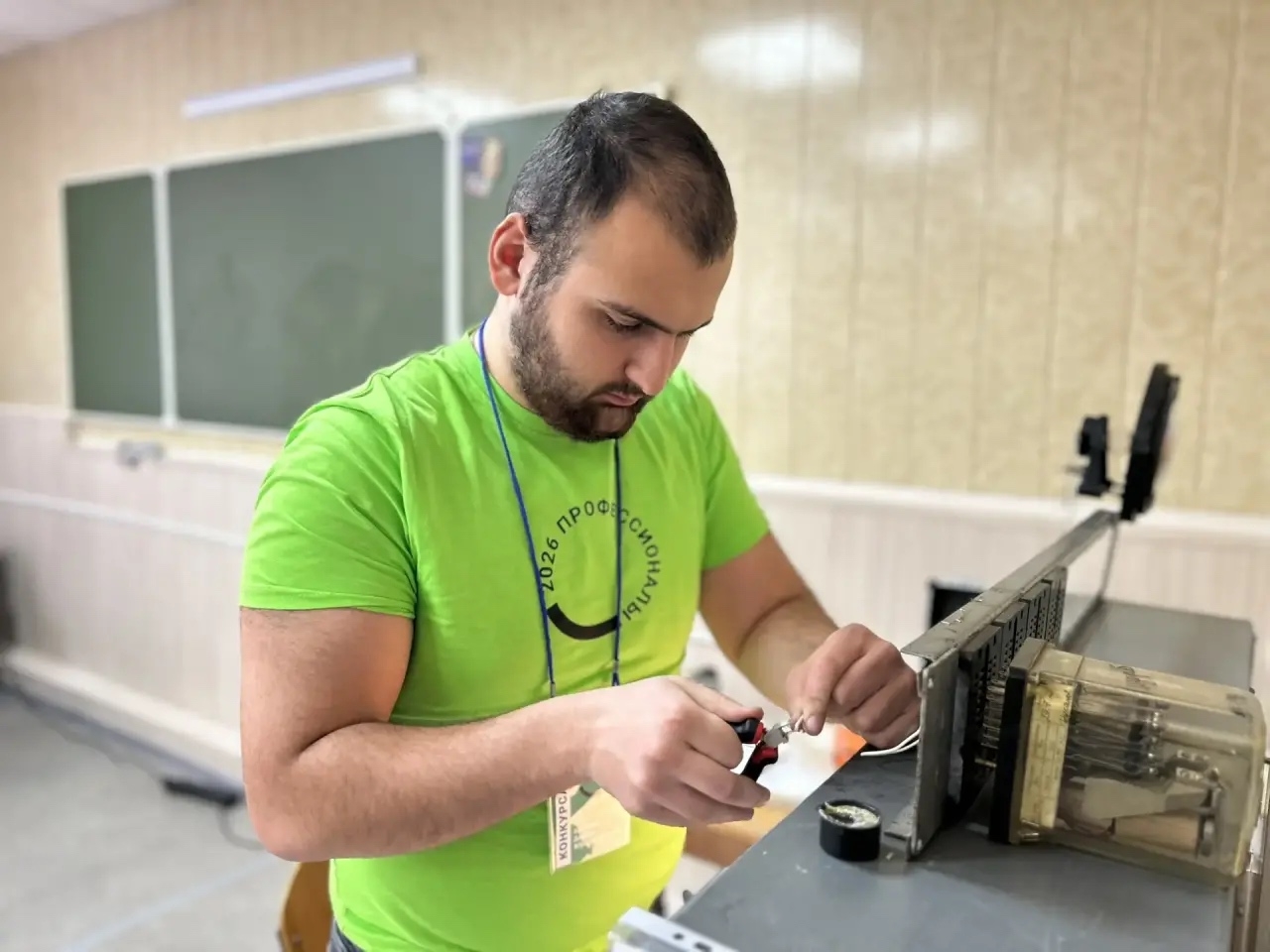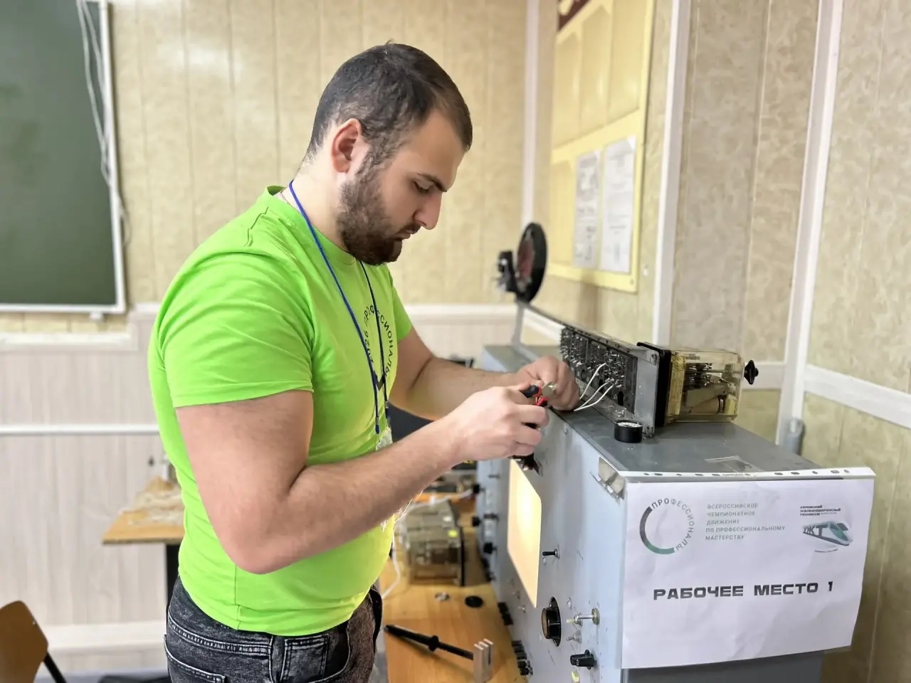 На рабочей площадке компетенции «Обслуживание и ремонт устройств железнодорожной автоматики и телемеханики» ходом состязаний руководит главный эксперт — преподаватель Денис Яфизов.